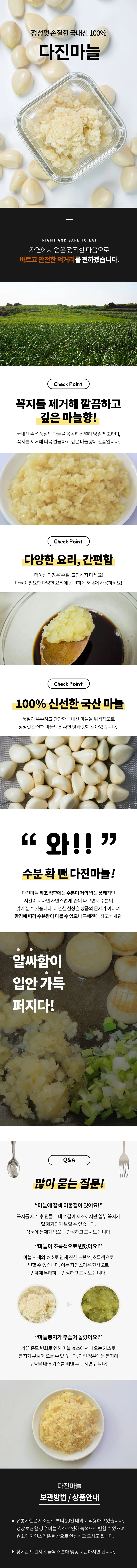 한국인의 밥상에 절대 빠지면 안되는 마늘! 100% 신선한 국내산 마늘로 품질이 우수하고 단단한 국내산 마늘을 위생적으로 손질해 마늘의 알싸한 맛과 향이 살아있습니다. 좋은 품질의 마늘을 꼼꼼히 선별해 당일 제조하며, 꼭지를 제거해 더욱 깜끔하고 깊은 마늘향이 일품입니다.